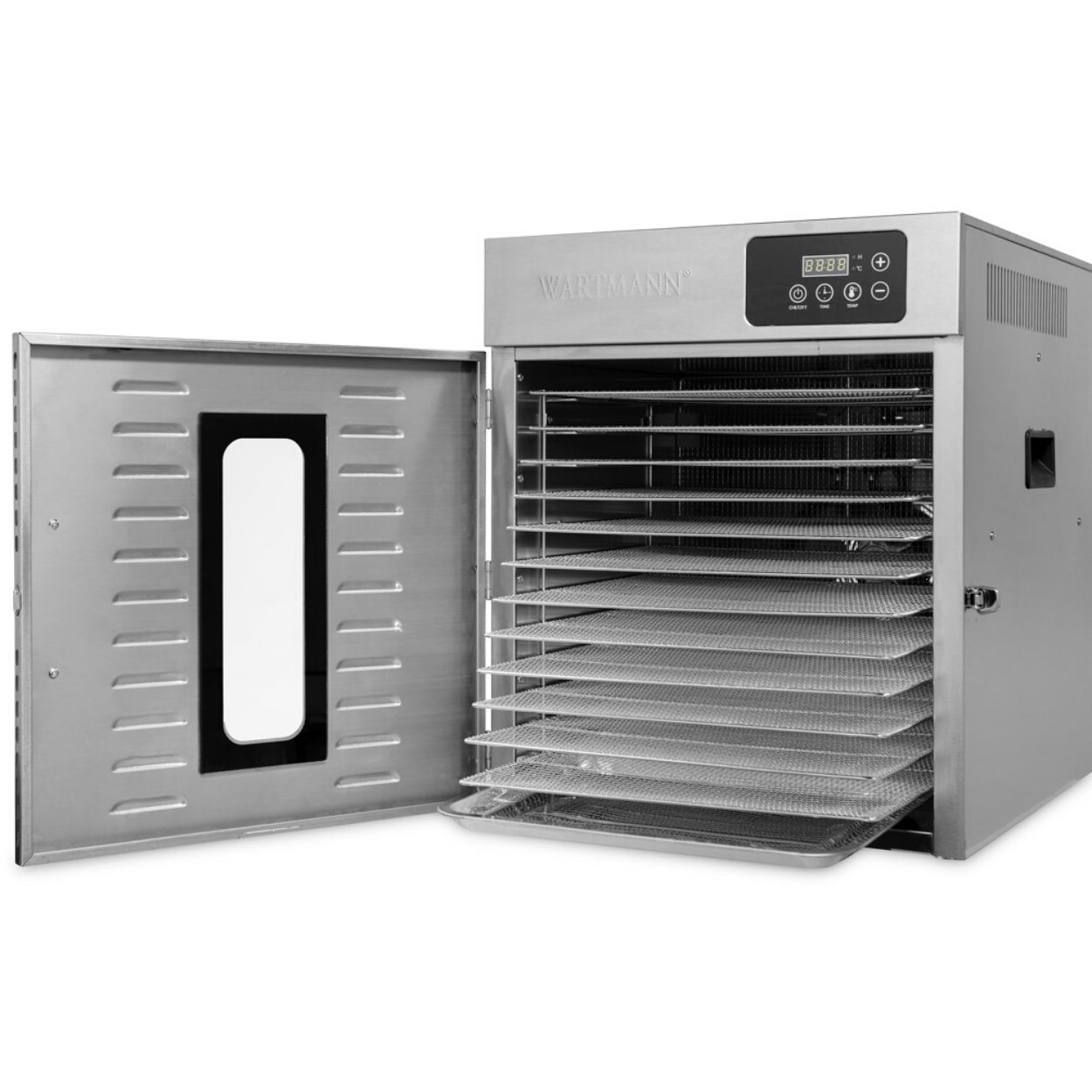 Dehidrator Wartmann ™ 12 polica ima kućište sa dvostrukom opnom za energetski učinkovit rad. Stakleni prozor na vratima daje jasan pogled na unutrašnjost dehidratora.